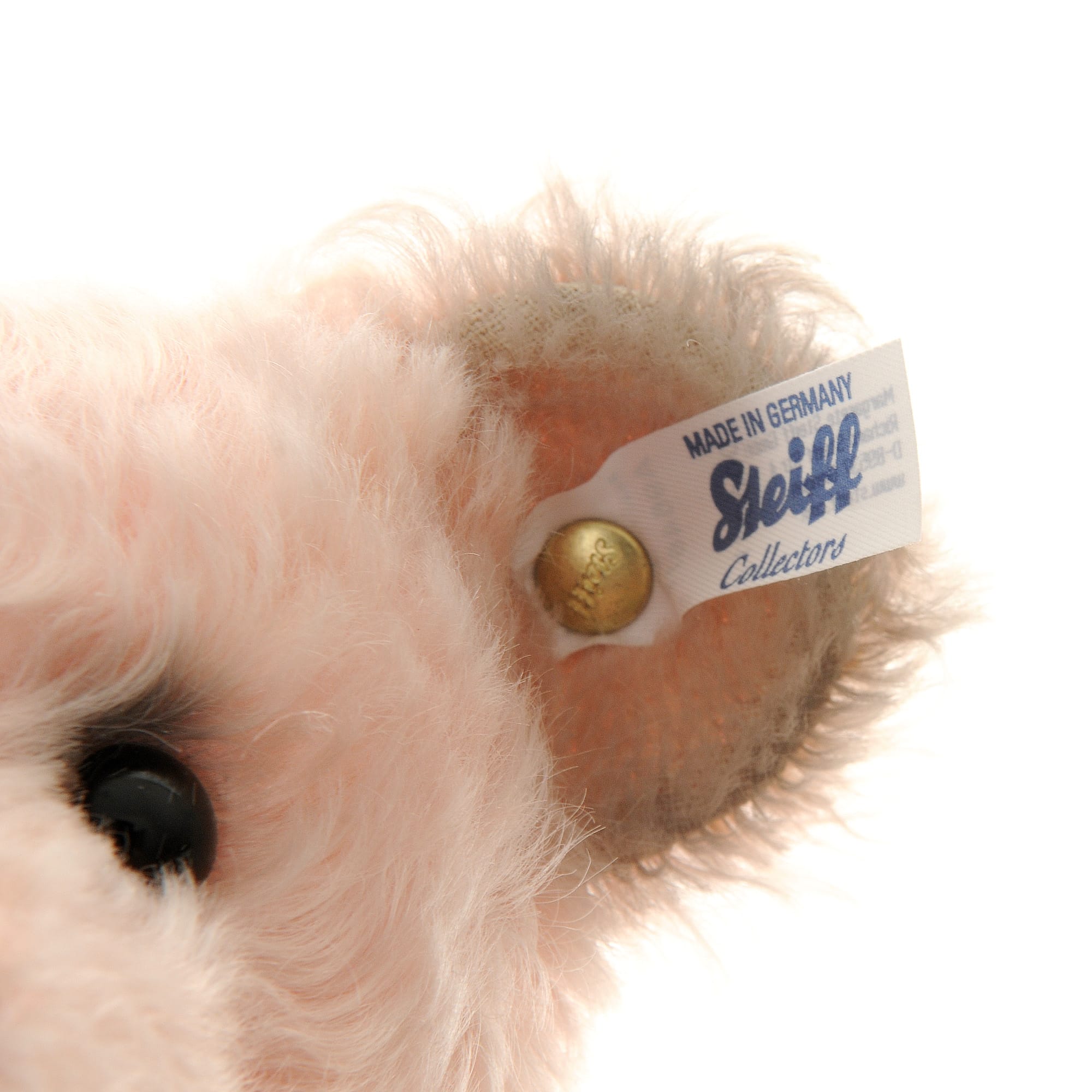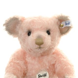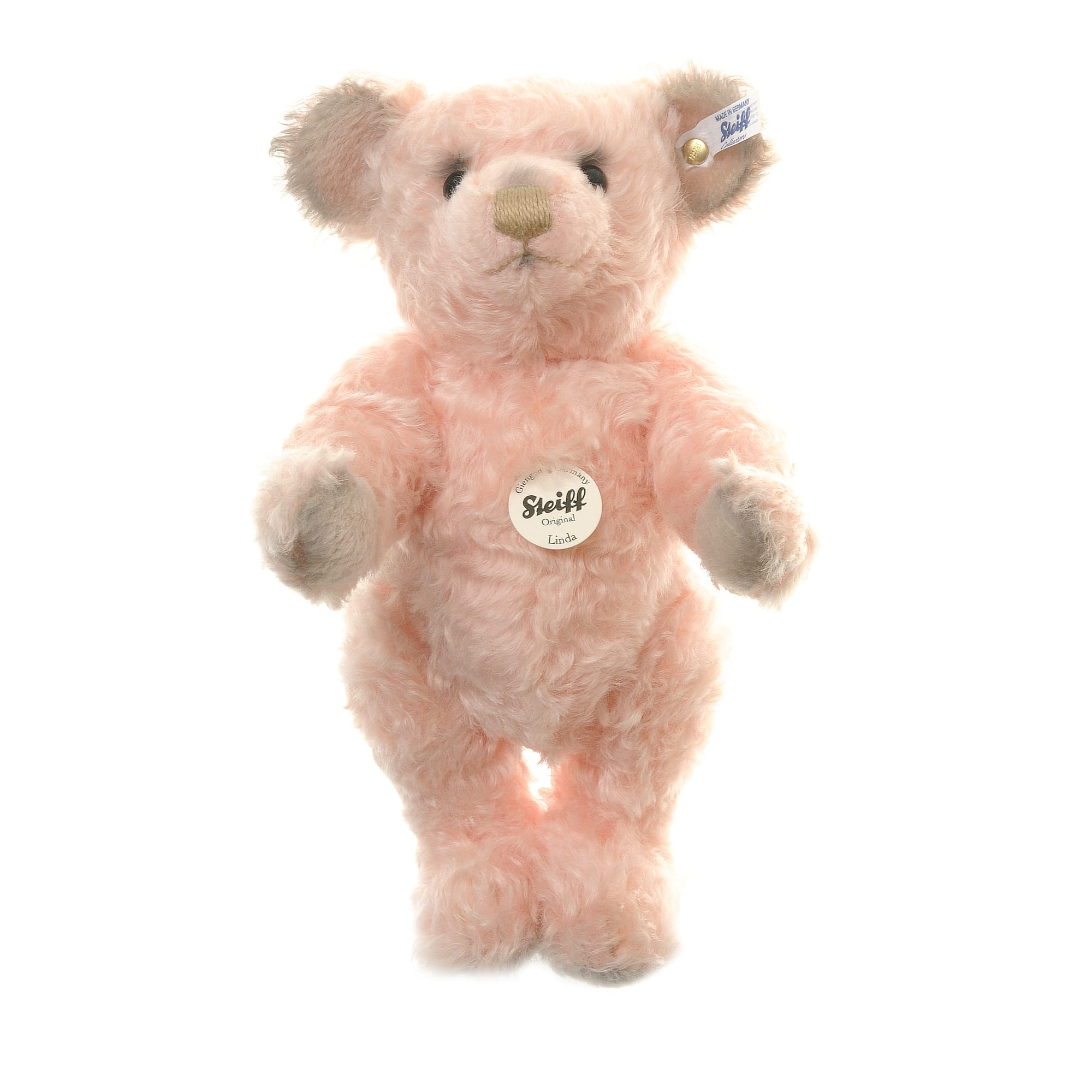 This pretty girl is Linda, a 30cm tall, fully jointed, mohair Teddy Bear with Growler, by the German maker – Steiff. Linda is crafted from a luxury, textured pale pink mohair, with unusually, grey mohair inner ears and paws. This piece also has the famous Steiff button-in-ear with a white label. Surface washable.