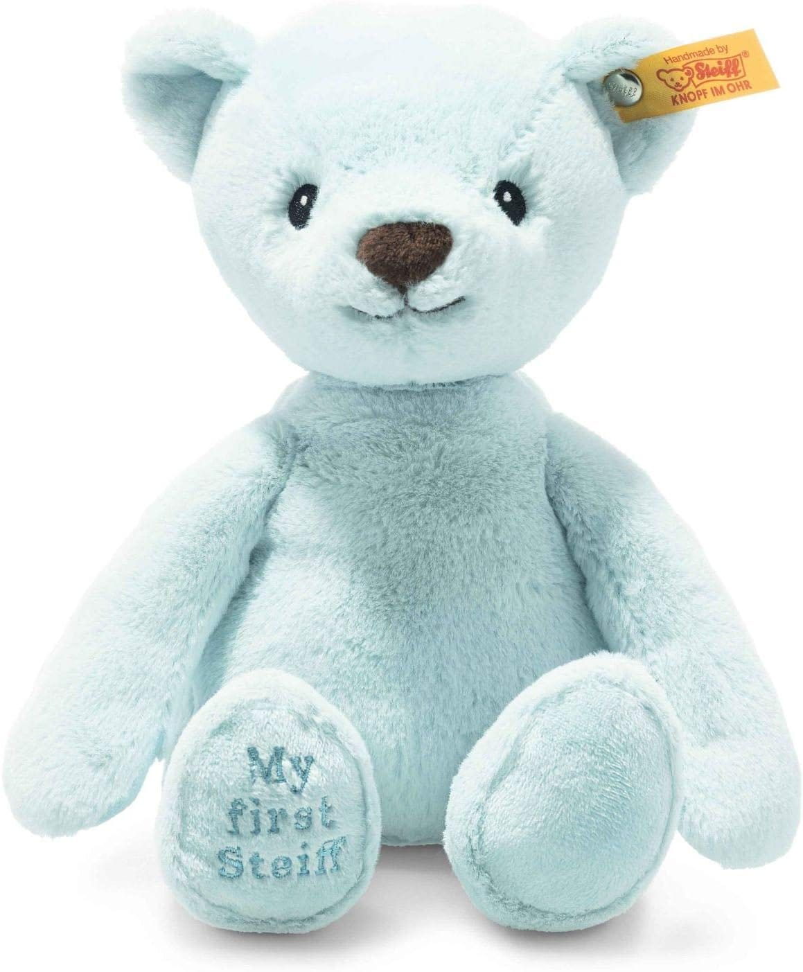 Soft Cuddly Friends My First Steiff Teddy Bear 26 cm Cuddly Toy for Babies Cuddly and Soft Washable Our My First Steiff Teddy Bear is a faithful companion from the first minute. It gives your baby security and is cuddly soft. My first Steiff teddy bear – size 26 x 19 x 11 cm – fur: baby soft plush – colour: Blue – washable at 30 °C in the washing machine. Steiff quality promise. Margarete Steiff GmbH is the world’s most famous toy and plush toy manufacturer and stands for the highest quality since 1880. The principle of our company founder Margarete Steiff “Only the best is good enough for children” is our company philosophy and shapes our work as well as each of our products. All our animals are sewn by hand, making them unique. Each original Steiff animal is proudly wearing the Steiff “Button in Ear” and also an ear flag as a further identification sign. This is proof that it comes from our house. Steiff animals – only real with the Steiff “button in the ear”. We hope you enjoy the new plush toy – your Steiff team