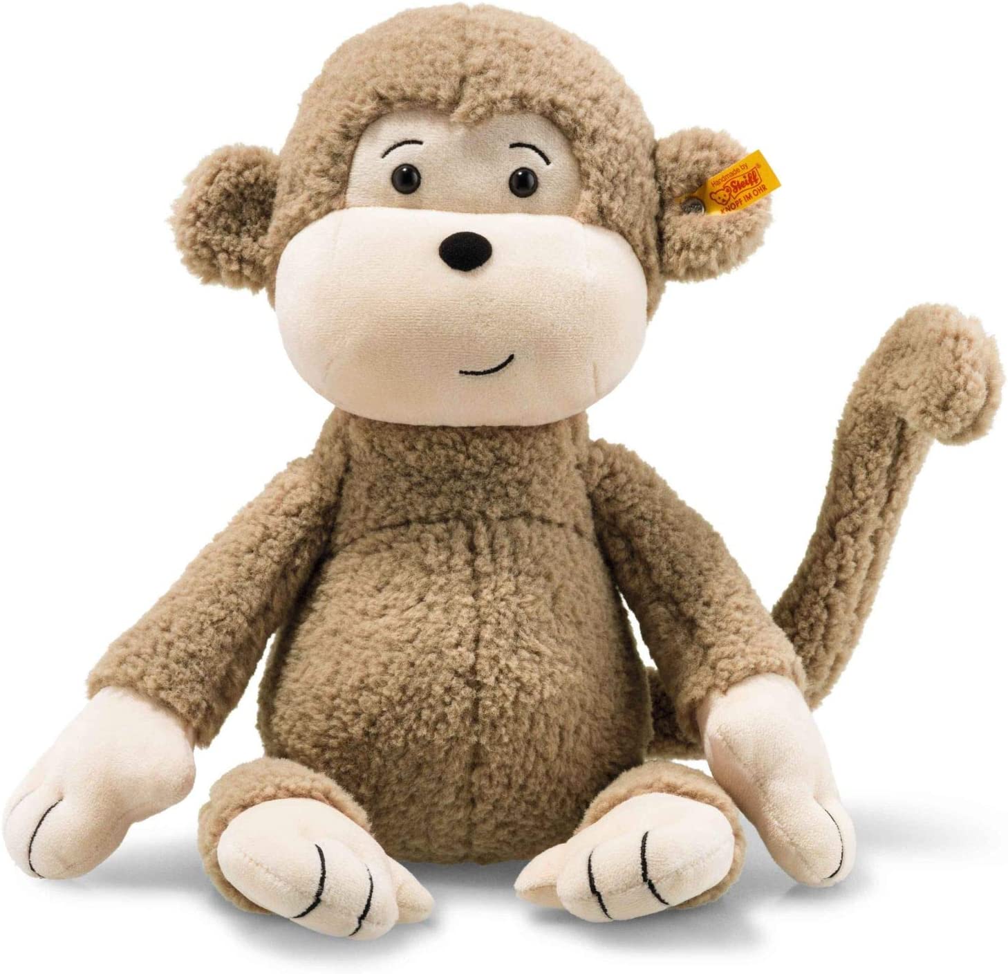 Directly from the tropical jungle to the children’s room comes the large Soft Cuddly Friends Brownie Monkey. It climbs with your child everywhere. Together, the two will laugh, fall, play, experience… Brownie monkey smiles with the indicated mouth and the upward brows ask what adventure is probably next. You can grasp and touch it so beautifully. Face, hands and feet are made of short plush, the fur is made of long, cuddly soft plush. The different surfaces invite you to feel and feel. In the evening, brownie monkey can of course go into the bed, because he also wants to be stroked into sleep by his best friend.
